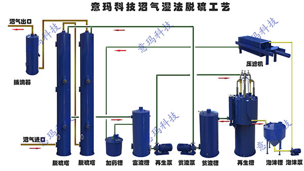 湿法脱硫可以归纳分为物理吸收法、化学吸收法和氧化法三种。物理和化学方法存在硫化氢再处理问题,氧化法是以碱性溶液为吸收剂,并加入载氧体为催化剂,吸收H2S,并将其氧化成单质硫,湿法氧化法是把脱硫剂溶解在水中,液体进入设备,与沼气混合,沼气中的硫化氢(H2S)与液体产生氧化反应,生成单质硫吸收硫化氢的液体有氢氧化钠、氢氧化钙、碳酸钠、硫酸亚铁等。成熟的氧化脱硫法,脱硫效率可达99.5%以上。
